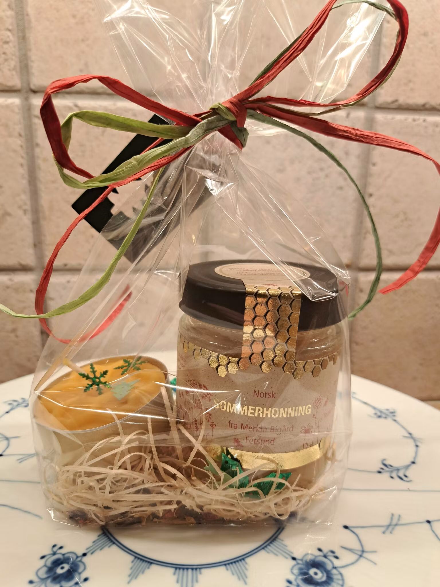 Cellofanpose med sommerhonning og stort telys.