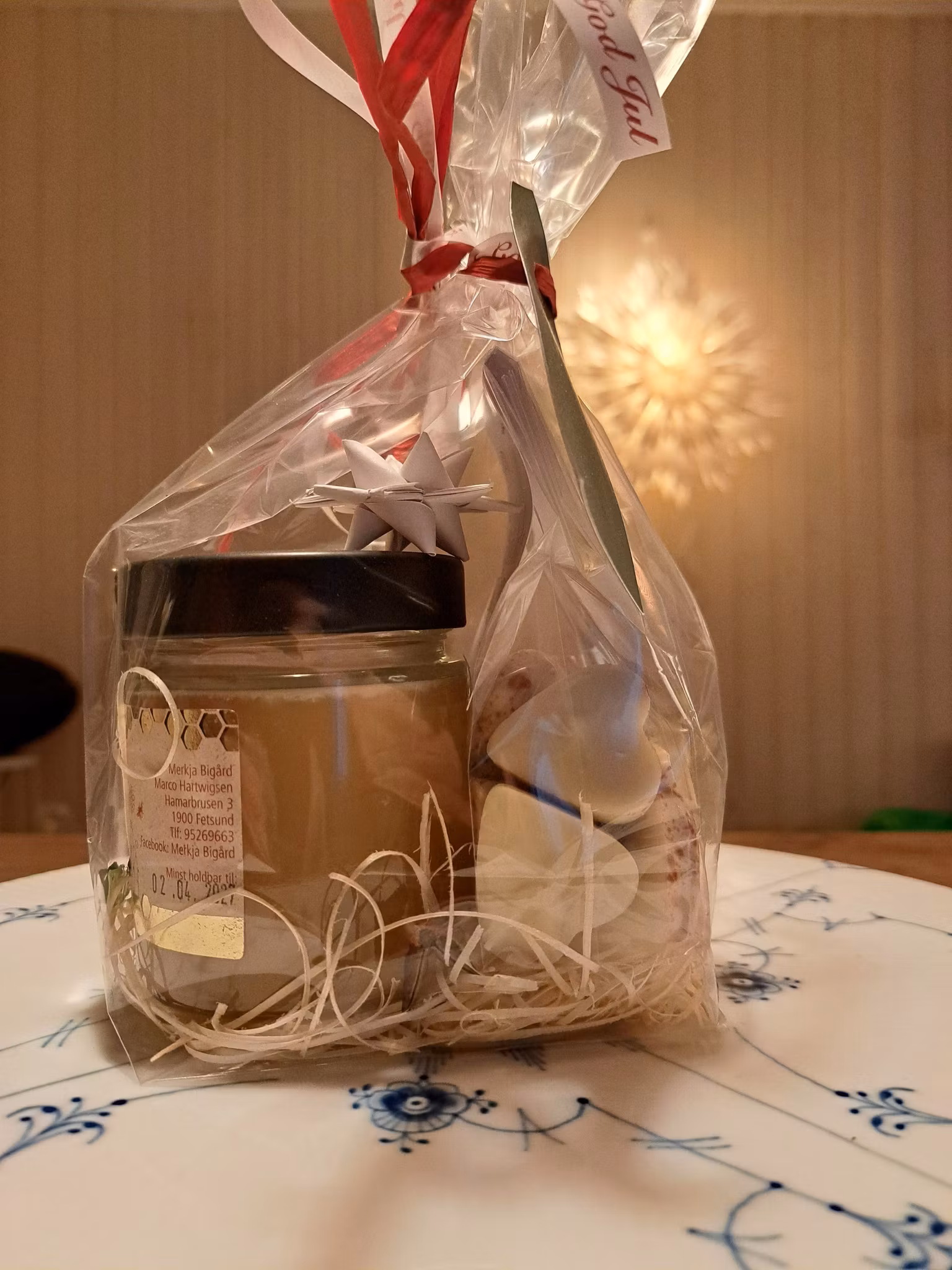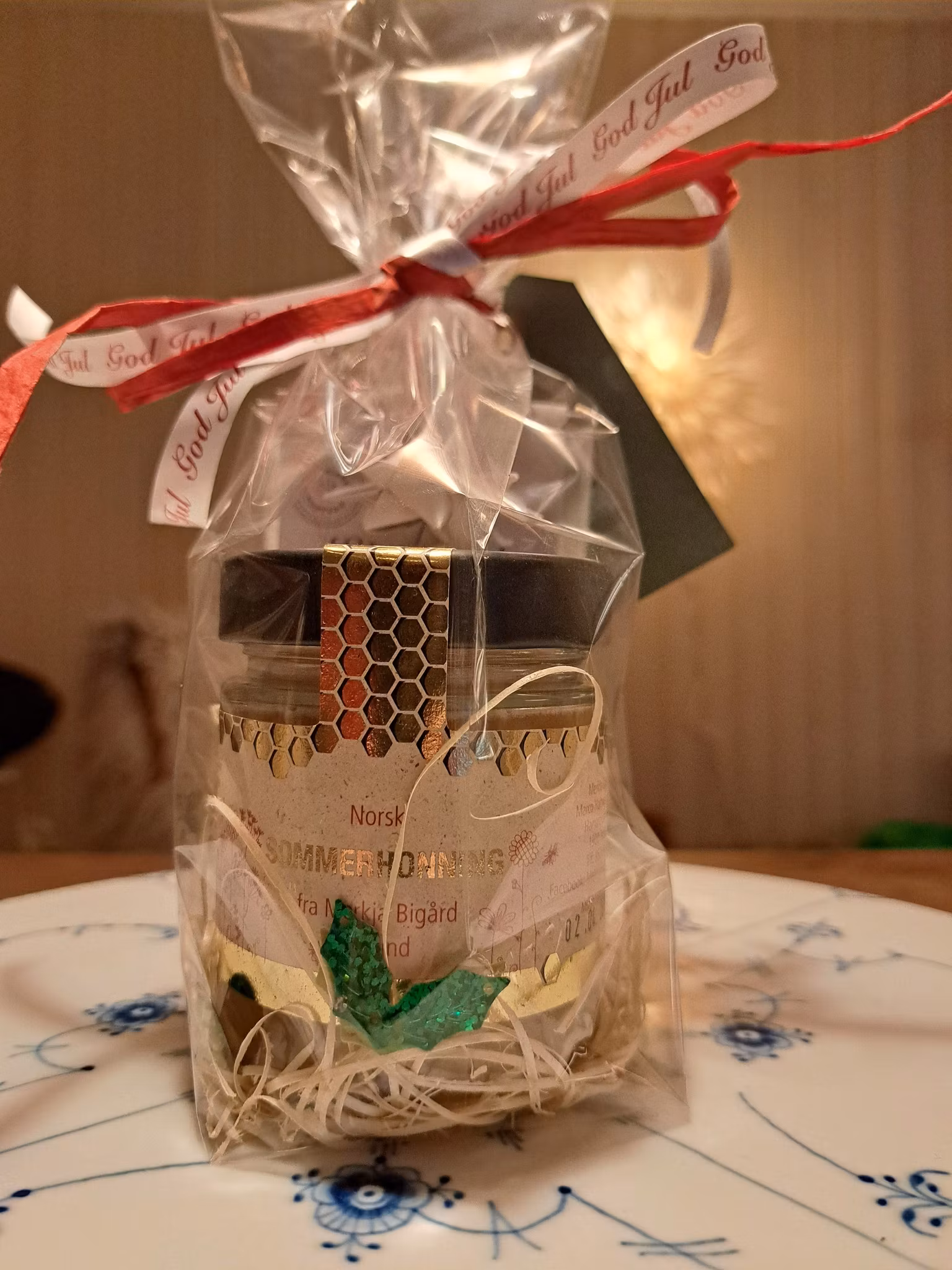 Cellofanpose med sommerhonning og konfekthjerter med skogsbærhonning (fra oss) og chili.