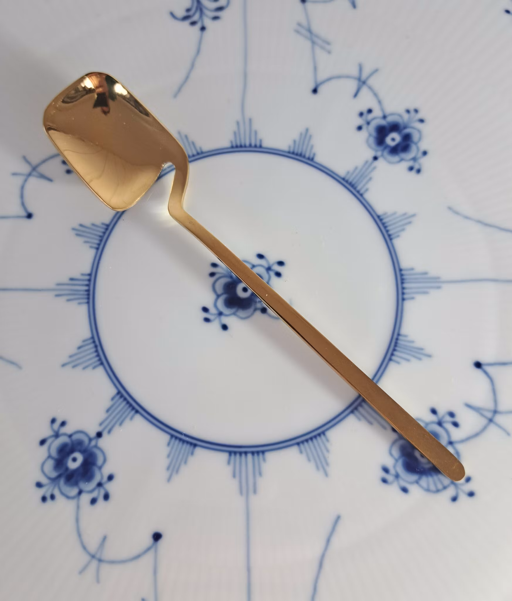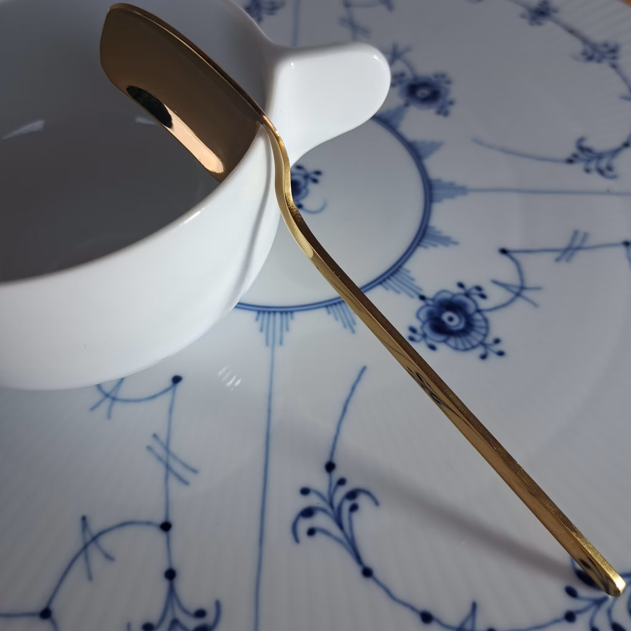 Skjeen kan henges på kanten av koppen, slik at honning og te kan dryppe ned i koppen. Veldig praktisk!