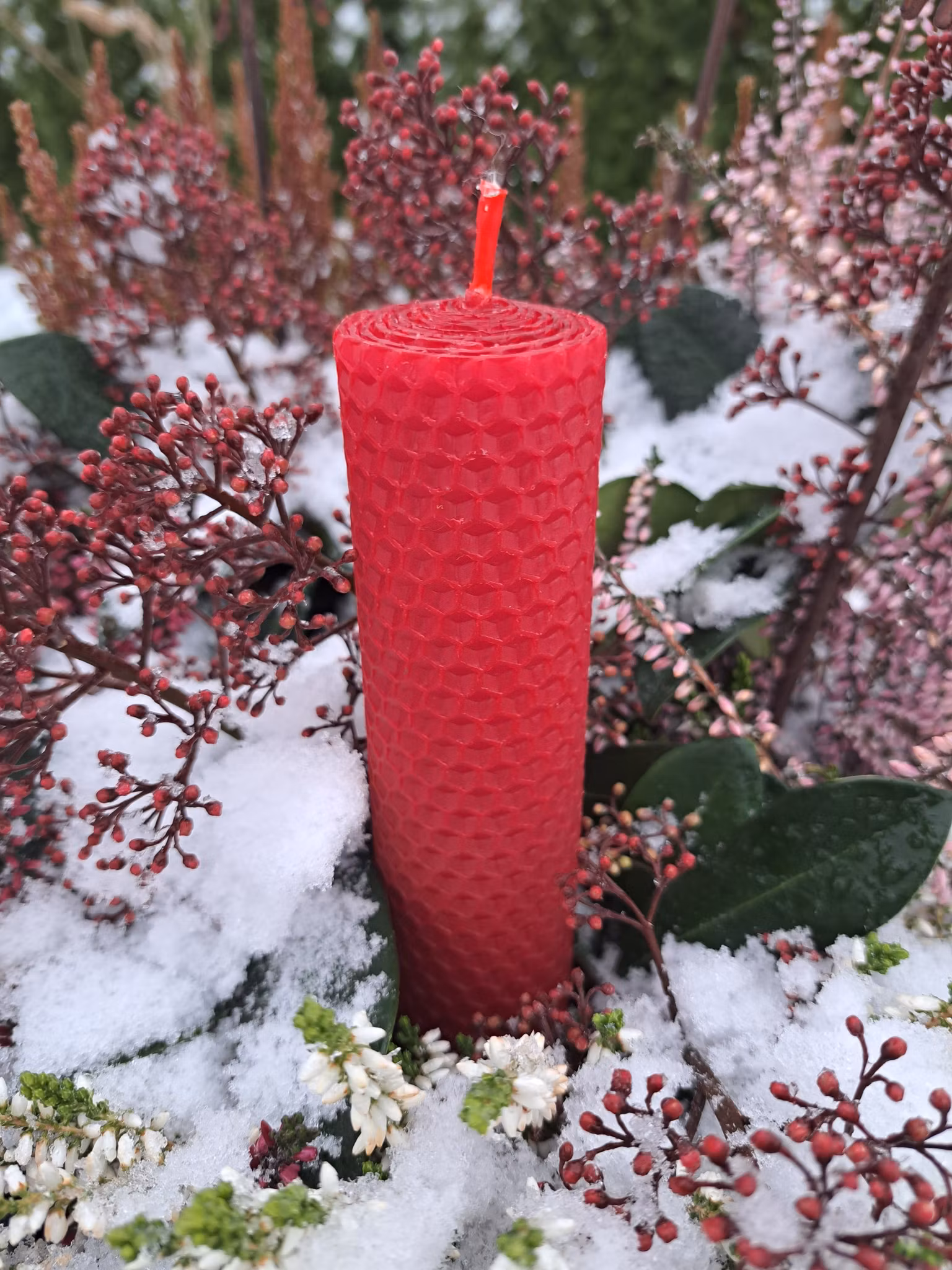 Håndrullede bivokslys i rødt.