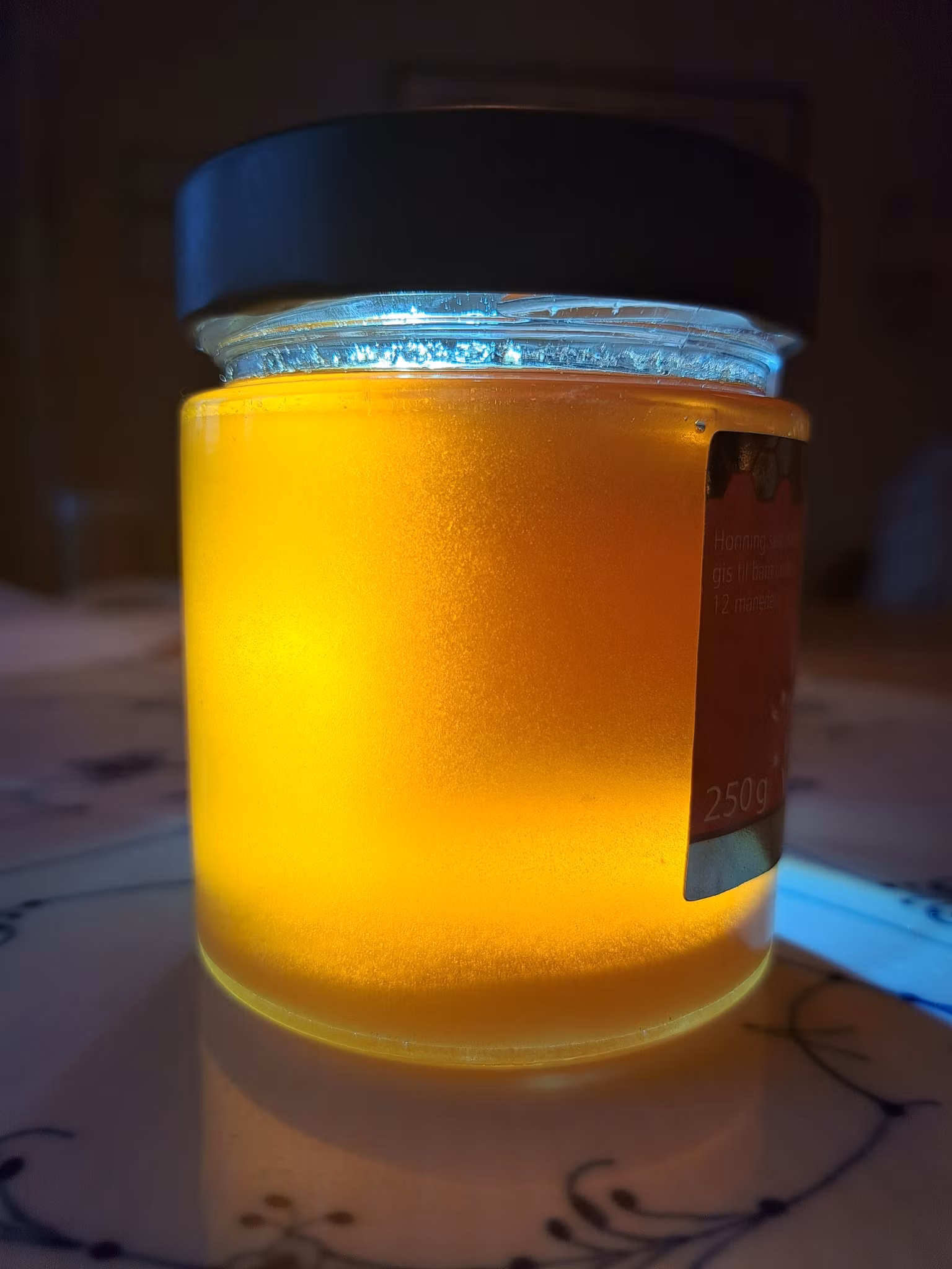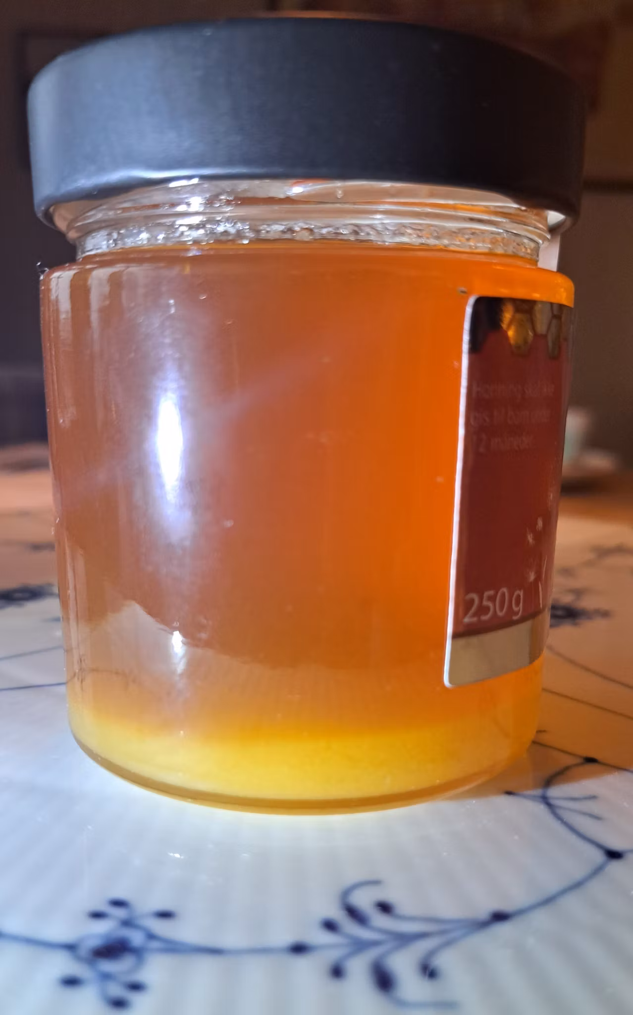 Redusert pris pga. avvikende konsistens. Honningen er delvis flytende, men har et lag av faste krystaller i bunnen som heller ikke blir flytende i vannbad.