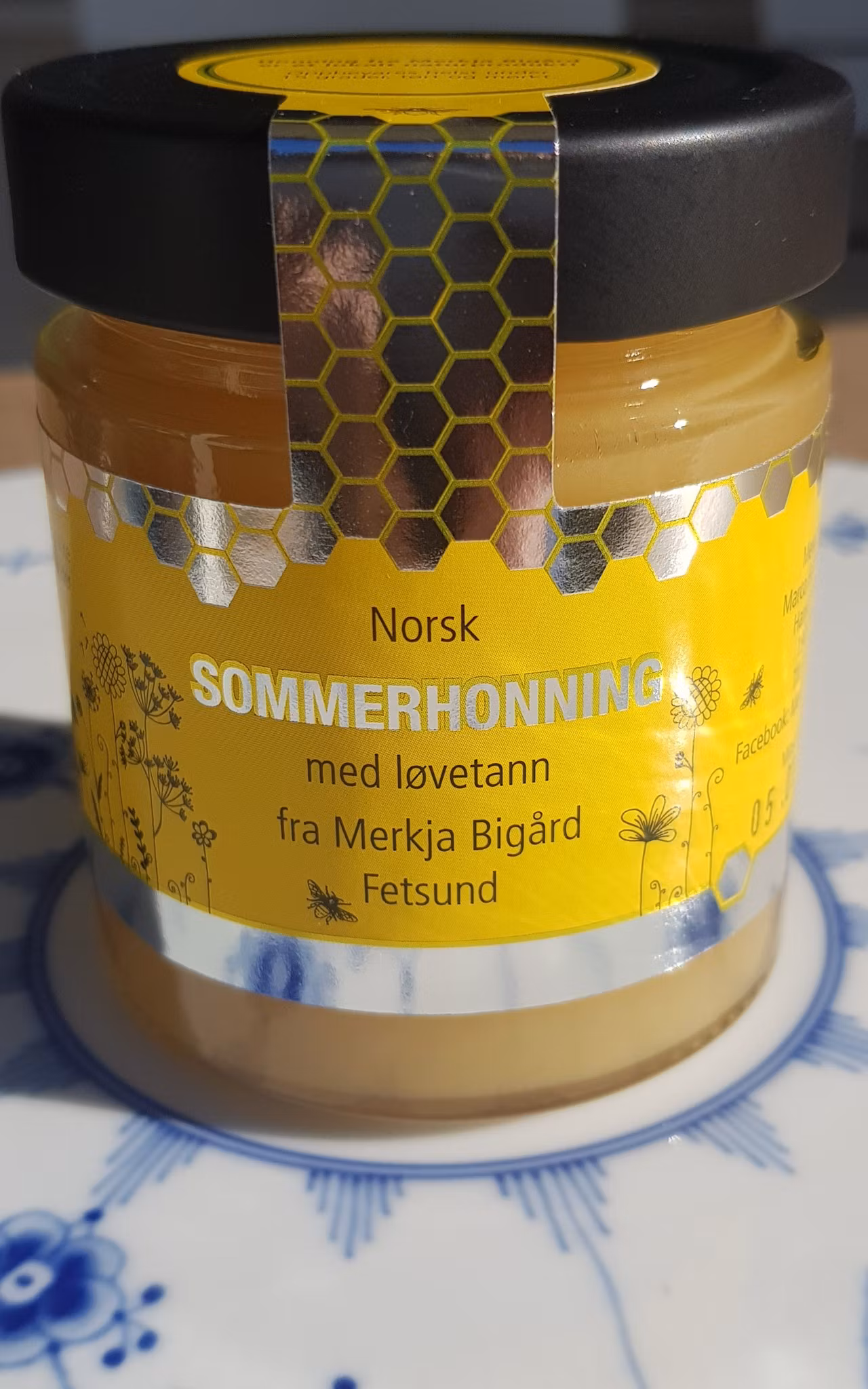 Sortshonning: Løvetannhonning (Etikett: Sommerhonning med løvetann)